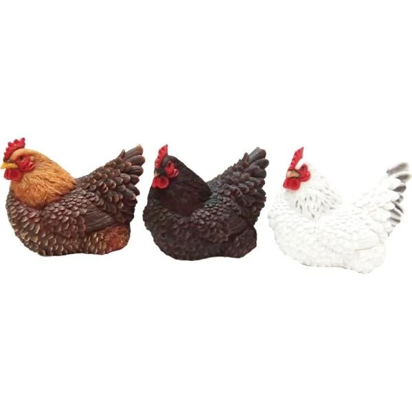 De kippen zijn verkrijgbaar in drie verschillende kleuren en zijn vervaardigd uit polyresin, een duurzame kunsthars die bestand is tegen de meeste weersinvloeden. De kip kan dus zowel binnen als buiten worden geplaatst.
