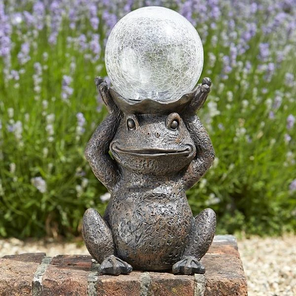 Deze lachende kikker ondersteunt een mooie lichtbol op zonne-energie. Deze tuindecoratie geeft overdag en ’s avonds een charmante sfeer aan jouw terras, patio, voordeur of plantenborder. De kikker is leuk gezelschap voor groot en klein en in het duister straalt de lichtbol een feeëriek licht uit. Geen elektrische voeding of bekabeling nodig want het zonlicht wordt door het zonnepaneel opgevangen en opgeslagen in interne batterijen. Dankzij de ingebouwde lichtsensor gaat de verlichting automatisch branden zodra het donker wordt.