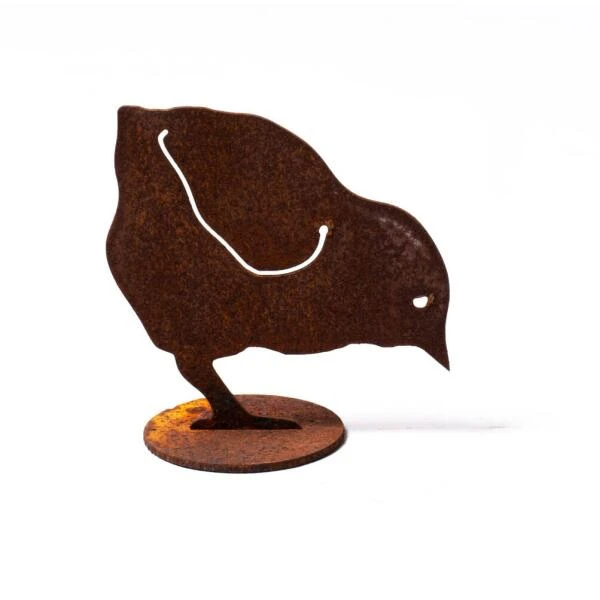 Dit kuiken is gemaakt uit speciaal gevormd en behandeld metaal met een roestige look. Met de voorziene stevige basis kan je het beeld zowel binnen als buiten een plekje geven.