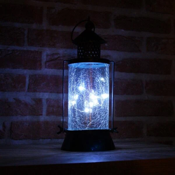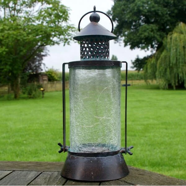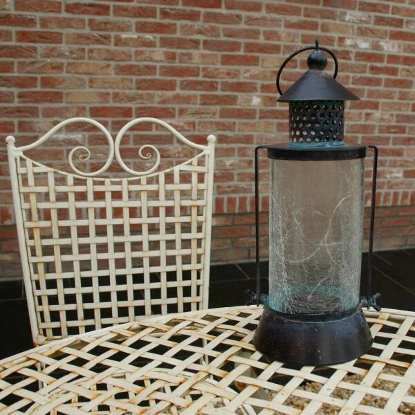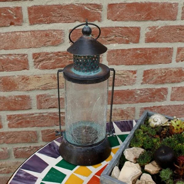 Deze mooie lantaarn heeft iets weg van een oude petroleumlantaarn. Het decoratief gekrakeleerd glas en metaal met verouderde look geeft deze lantaarn een oude uitstraling. Dit lichtpunt werkt op zonne-energie en geeft ’s avonds een gezellig sfeerlicht.