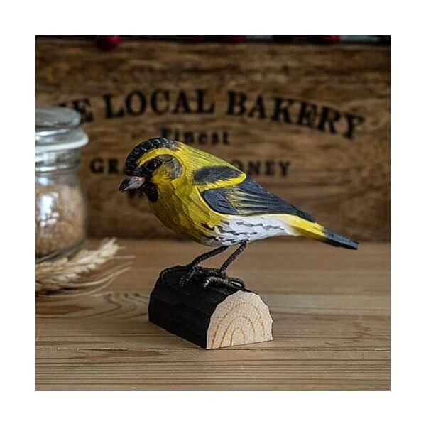 Ambachtelijk vormgegeven houten sijsje (Carduelis spinus). Het sijsje wordt op ware grootte weergegeven en is beschilderd met milieuvriendelijke verf.