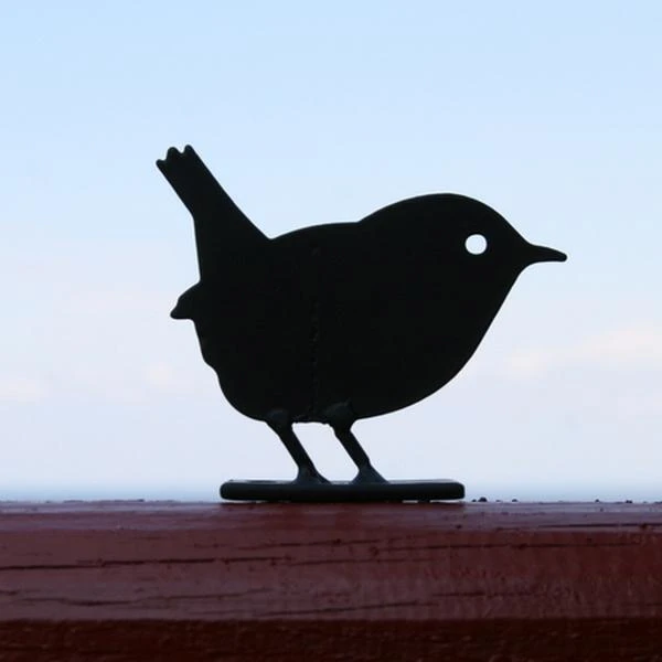Levensgroot silhouet winterkoning – winterkoninkje. Decoratief en karakteristiek zwart schaduwbeeld van een winterkoninkje. Het silhouet is vervaardigd van metaal bewerkt met een roestwerende, milieuvriendelijke zwarte verf.