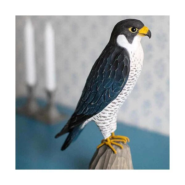 Ambachtelijk vormgegeven houten slechtvalk. De vogel wordt op ware grootte weergegeven en is beschilderd met milieuvriendelijke verf.