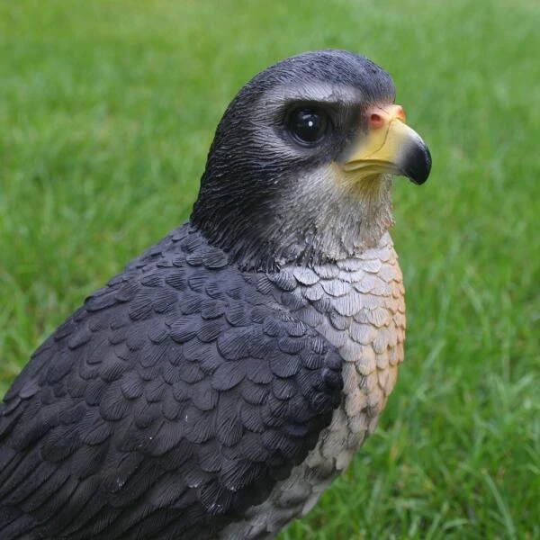 Deze beeld van een rustende valk op een boomstronk lijkt de de omgeving gade te slaan. Bij dit beeld zijn alle details heel mooi weergegeven en lijkt de roofvogel net echt. Het beeld is gemaakt uit polyresin, een duurzame kunsthars dat tegen heel wat weersinvloeden bestand is.