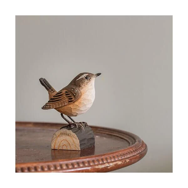 Ambachtelijk vormgegeven houten winterkoninkje. De vogel wordt op ware grootte weergegeven en is beschilderd met milieuvriendelijke verf.