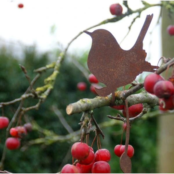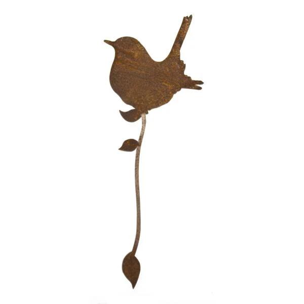 Dit silhouet van een lief winterkoningkje is een leuke decoratie gemaakt uit speciaal gevormd en behandeld metaal met een roestige look. Het decoratieve takje in metaal kan rond een tak van een boom of struik worden gedraaid zodat het lijkt alsof de vogel net op die tak is geland.