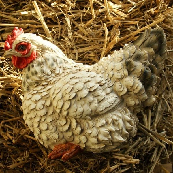 Prachtig levensechte weergave van een zittende kip. Mooi beeld vervaardigt uit duurzaam kunsthars geschilderd als een echte witte legkip